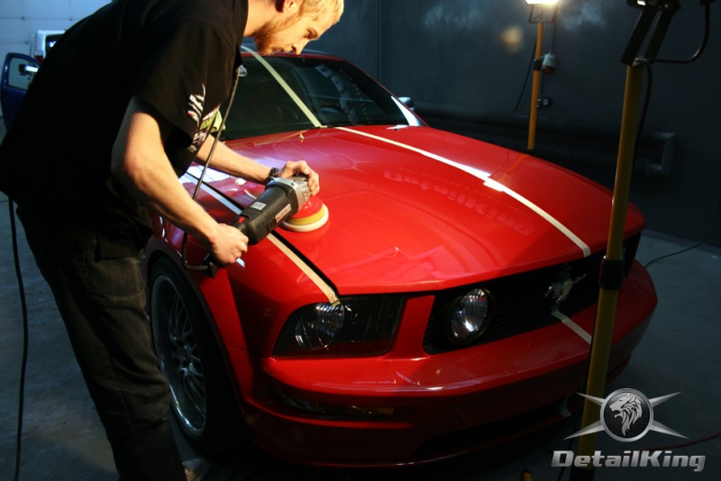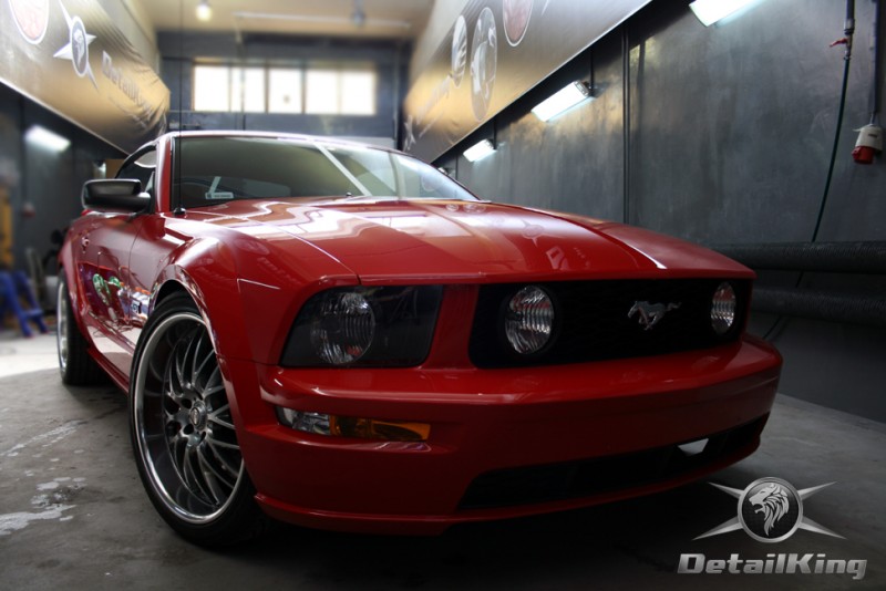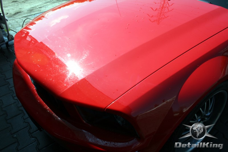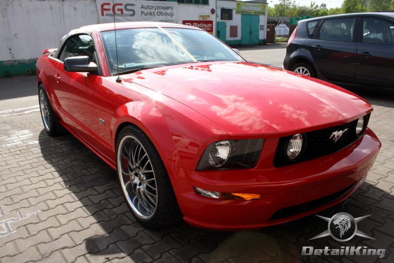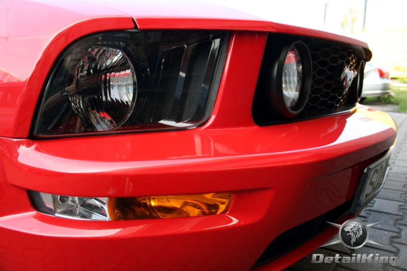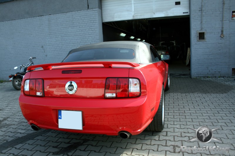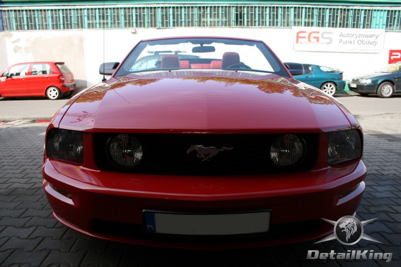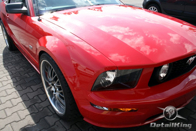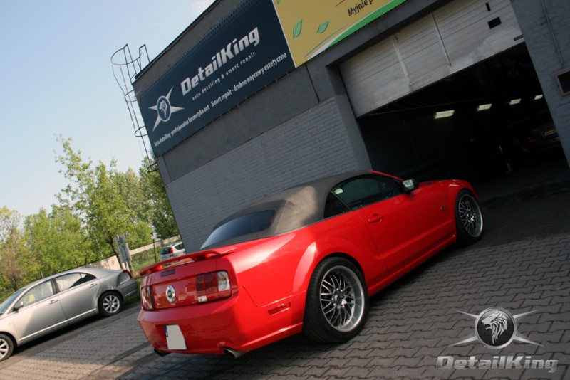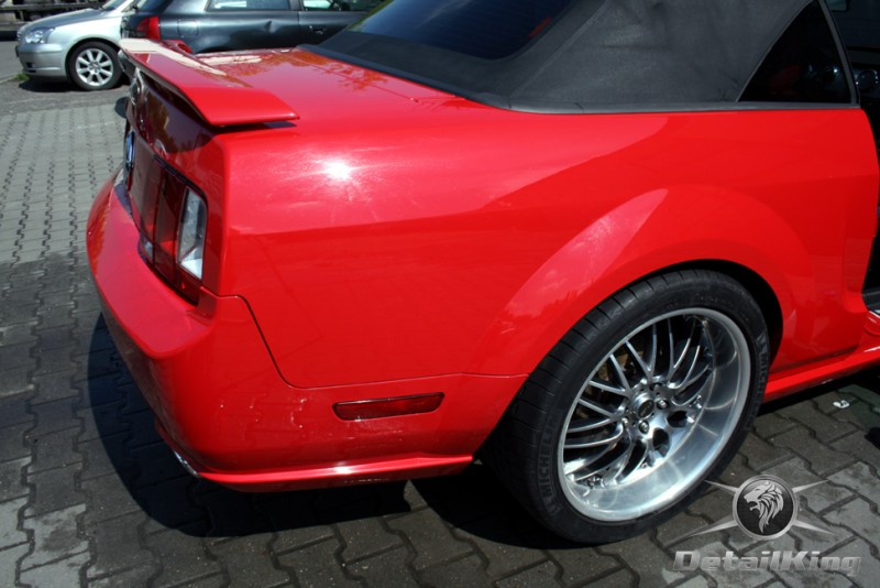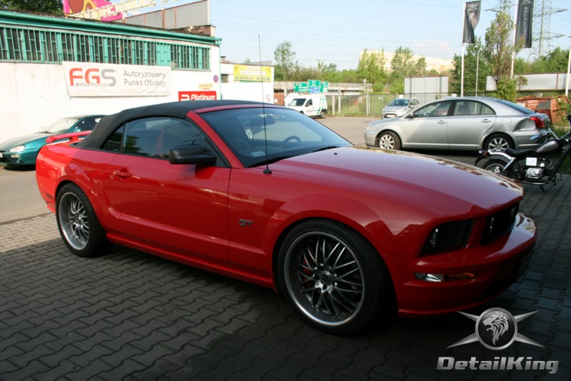 Prezentujemy zdjęcia z procesu przygotowania naszego show-car'a - Forda Mustanga GT. Aby jak najlepiej zaprezentować nasze możliwości, samochód został zrobiony jedynie w połowie. Daje to obraz tego jak samochód może wyglądać po naszych pracach w porównaniu do samochodu nie wypielęgnowanego. Lakier na prawej stronie samochodu został poddany trzy etapowej korekcie, po wcześniejszym oczyszczeniu, a na koniec otrzymał dwu warstwową powłokę zabezpieczającą DetailKing. Felgi oraz nadkola z prawej strony zostały gruntownie oczyszczone i zabezpieczone, a ranty felg wypolerowane. Również winylowy dach został w połowie oczyszczony i zabezpieczony, podobnie jak skórzana tapicerka i plastikowe elementy wnętrza.