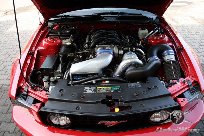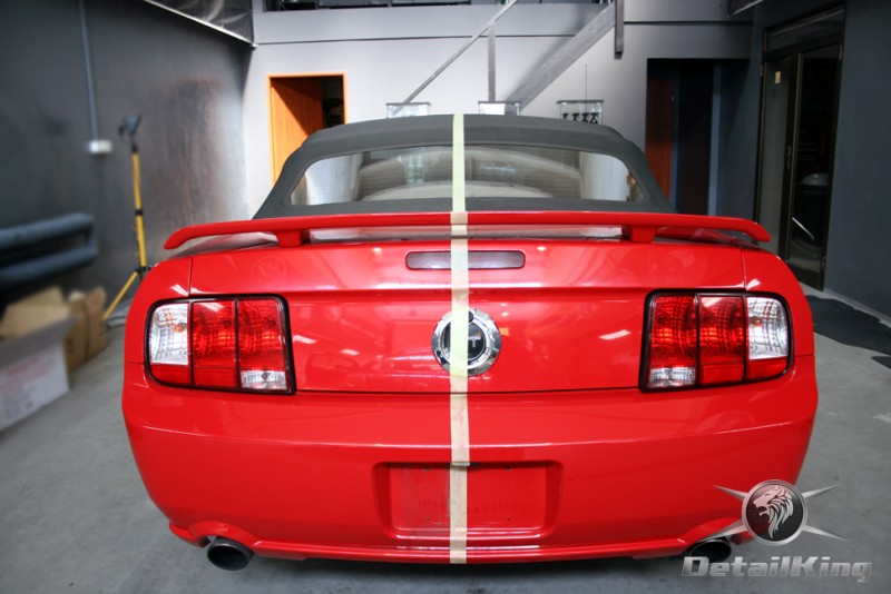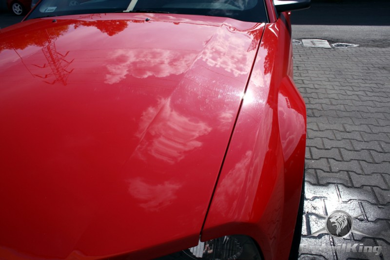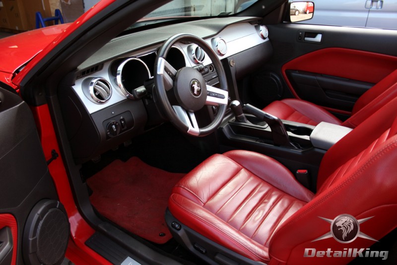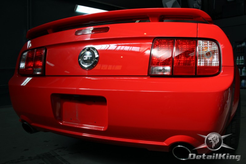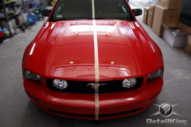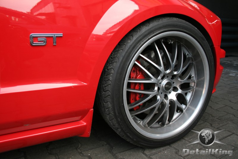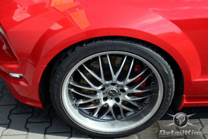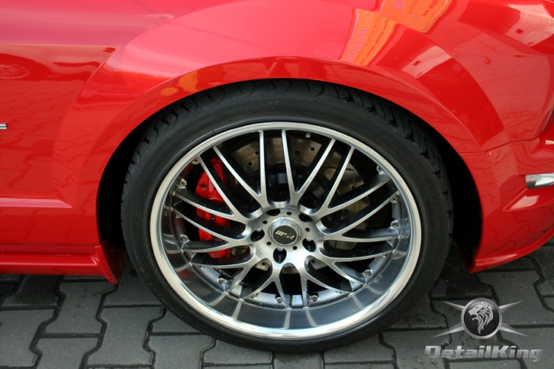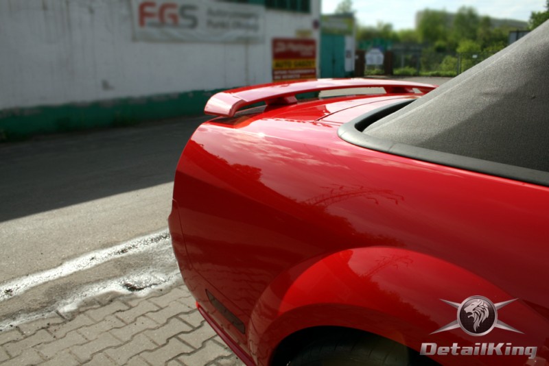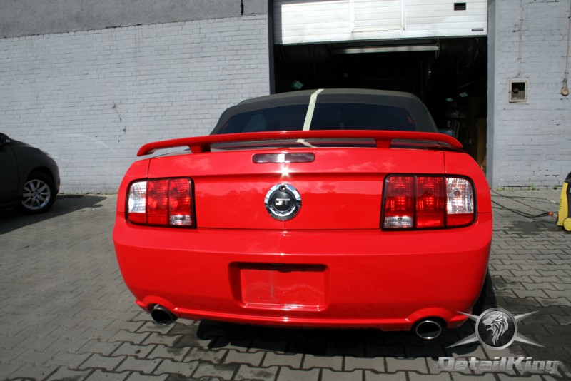 Prezentujemy zdjęcia z procesu przygotowania naszego show-car'a - Forda Mustanga GT. Aby jak najlepiej zaprezentować nasze możliwości, samochód został zrobiony jedynie w połowie. Daje to obraz tego jak samochód może wyglądać po naszych pracach w porównaniu do samochodu nie wypielęgnowanego. Lakier na prawej stronie samochodu został poddany trzy etapowej korekcie, po wcześniejszym oczyszczeniu, a na koniec otrzymał dwu warstwową powłokę zabezpieczającą DetailKing. Felgi oraz nadkola z prawej strony zostały gruntownie oczyszczone i zabezpieczone, a ranty felg wypolerowane. Również winylowy dach został w połowie oczyszczony i zabezpieczony, podobnie jak skórzana tapicerka i plastikowe elementy wnętrza.